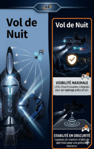 • Vol de Nuit : Équipé de LED puissantes pour une visibilité maximale dans l’obscurité.